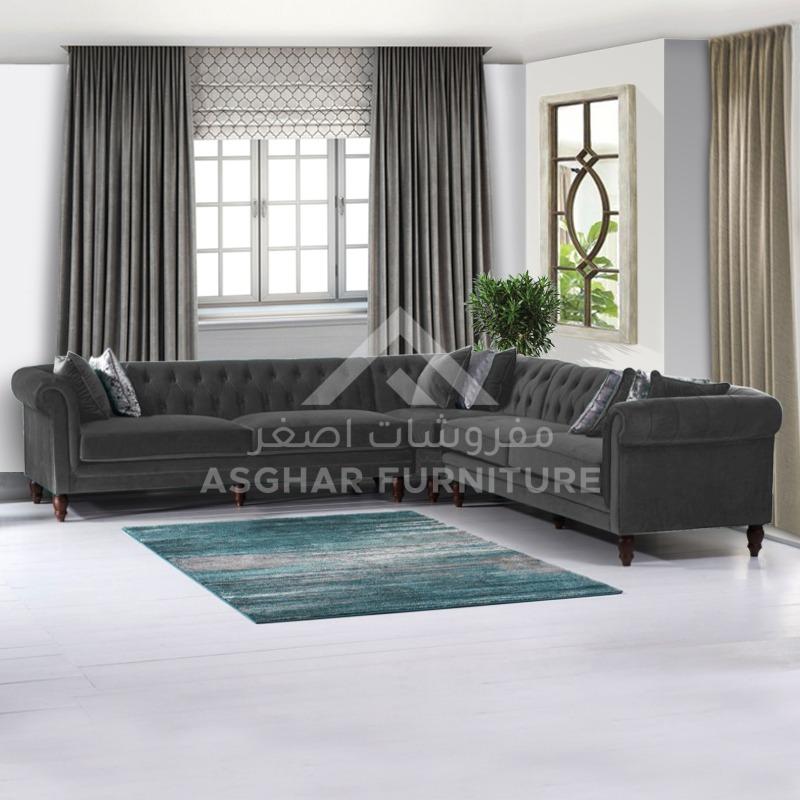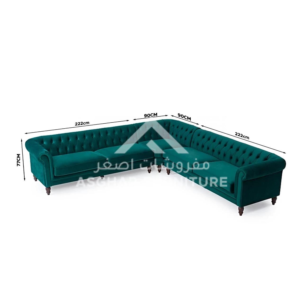 At Asghar Furniture, The modern design of the Emerson Corner Sofa makes a chic statement in any living room setting. Boasting a stunning Chesterfield inspired design, the space saving sofa is a practical and stylish addition to your home. Upholstered in smooth, luxurious velvet, the sofa features a charming deep-buttoned style complemented by elegant scrolled armrests. Description