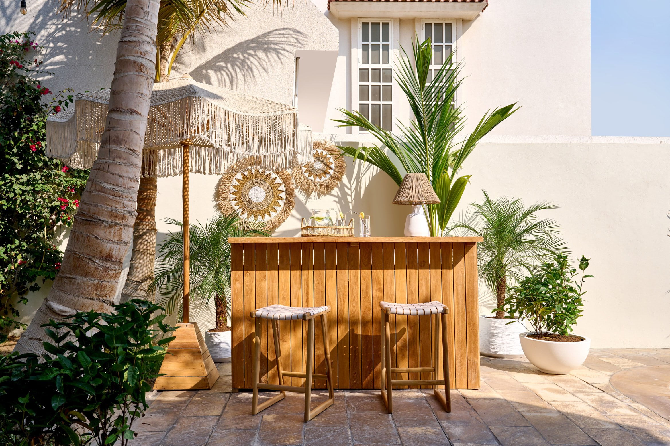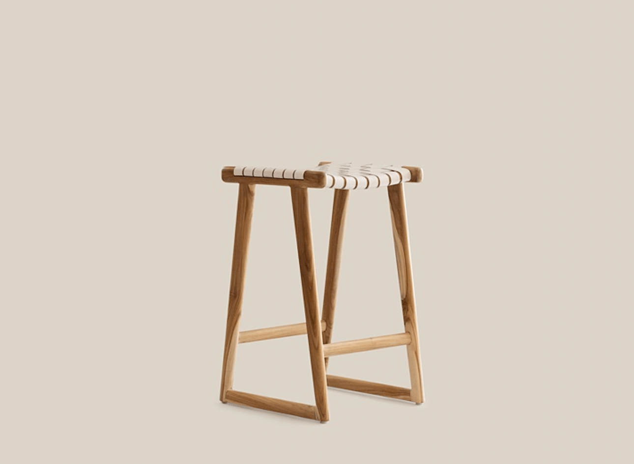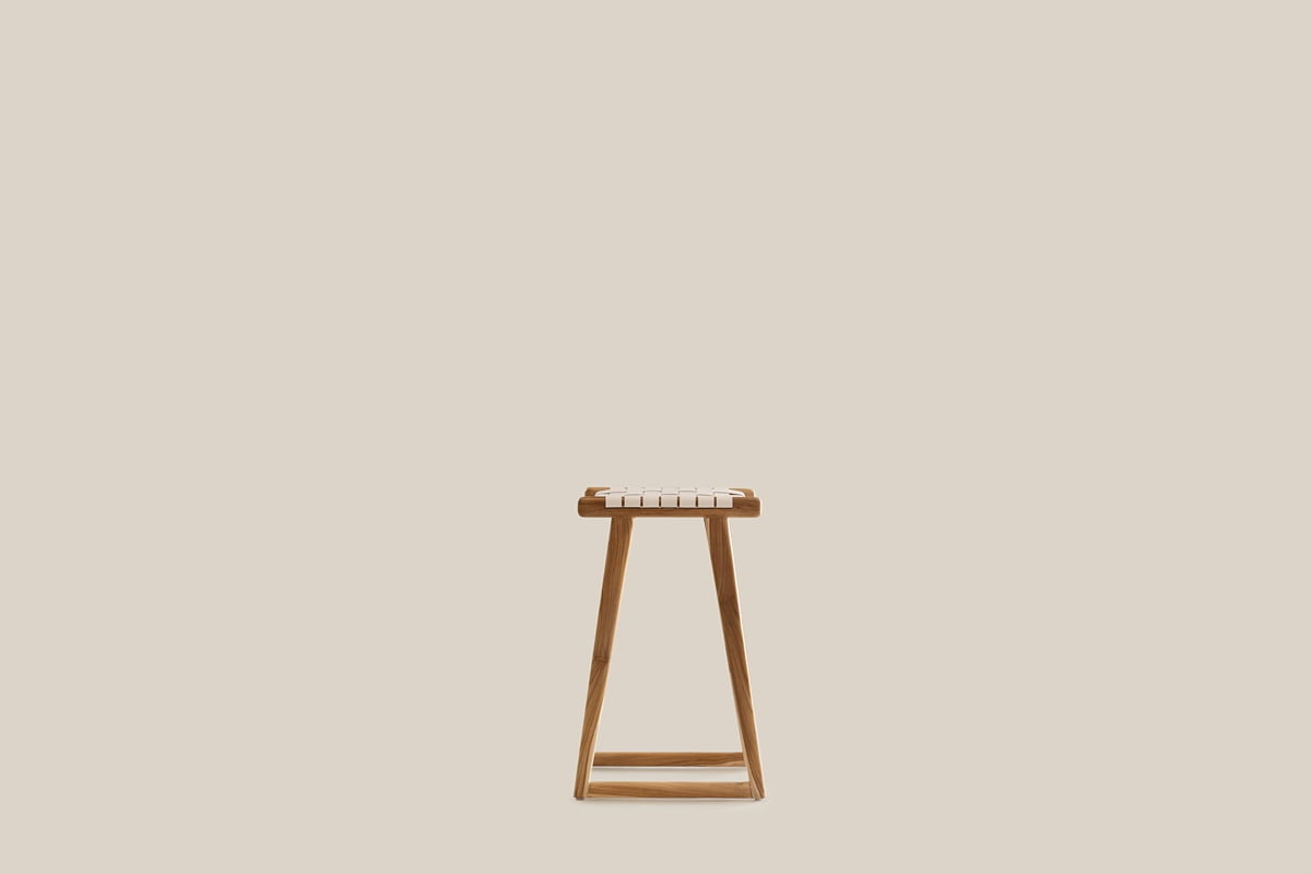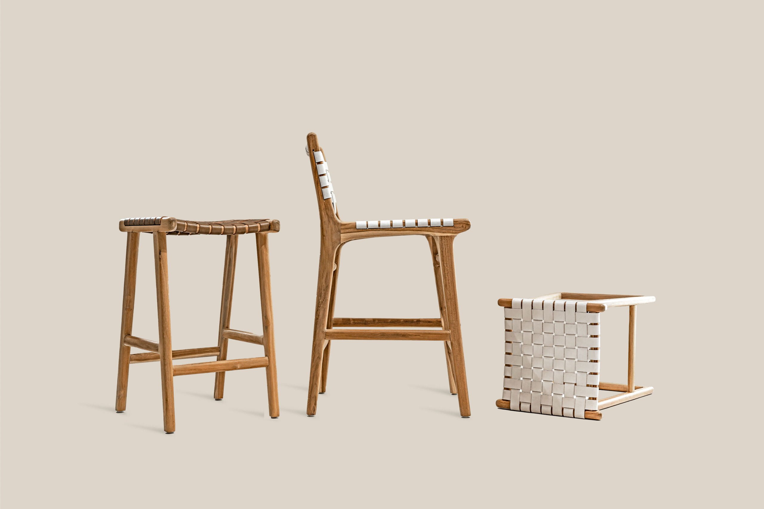 Teak wood San Marino Bar Stool with a contrast white leather weaving.