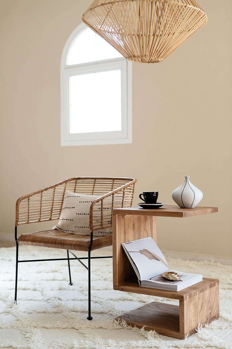 Lightweight rattan chairs will open up your space and invite your extra guests when needed. Sustainable, Organic & handmade. Natural with black legs.